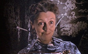What was interesting was the studio which made The Old Dark House reimagining, not Universal but the British bunch who took up their international mantle as the go-to guys for screen horror, Hammer. Castle, ever on the lookout for a profitable proposition, teamed up with them at the height of their popularity and along with Tom Poston as the American expat in Cornwall, cast a motley crew of local talent to fill out the roles of the crazy Femm family (at least they kept the name). Therefore a selection of Brits who had a following of differing sorts were meant to provide the laughs and chills, with Robert Morley as the gun-loving head of the household, Joyce Grenfell as the ever-knitting matriarch, Janette Scott as the apparently fearful and "normal" one, and so on - but there was another leading lady sharing the screen, and she was Fenella Fielding as Morgana in something of a dry run for the role which would give her big screen immortality.