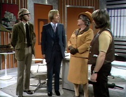 Fourth was The Playgirl Club, an episode that only exists in black and white now thanks to the colour version being wiped, and endeavouring to get to grips with women's liberation in a very Goodies manner. Mollie Sugden surprised them by visiting as a Cabinet Minister, and now they have their telephone put in they can send Tim to pretend to be female on the call box phone outside to hear her very particular problem: she has had photos taken in The Playgirl Club (the distaff Playboy Club) and wants them back. There followed a series of scenes you'd never get away with now, no matter how right on they were trying to be, as guest star Liz Fraser prompted Bill and Graeme to look up skirts, then dress as "wolves" (not bunnies) as Tim went undercover as the woman boss.