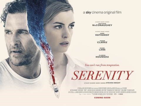 SKY CINEMA is delighted to share a new clip (click above) and the UK poster for SERENITY, from Academy Award nominated writer and director Steven Knight (LOCKE), Academy Award winning producer Greg Shapiro (ZERO DARK THIRTY, THE HURT LOCKER) and starring Academy Award winning actors Matthew McConaughey (INTERSTELLAR, DALLAS BUYERS CLUB), Anne Hathaway (LES MISÉRABLES), Jason Clarke (MUDBOUND) and the Academy Award nominated Diane Lane (UNFAITHFUL). SERENITY will be released in UK and Irish cinemas and on Sky Cinema on 1st March 2019.