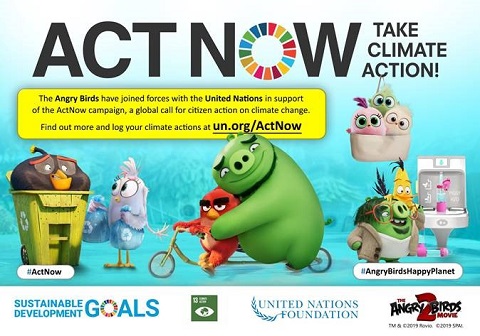 As part of the campaign, a public service announcement launched yesterday starring the Angry Birds, the green piggies and the English-speaking voice cast behind the film The Angry Birds Movie 2. Together, they are encouraging citizens to discover and track simple everyday actions that can make a difference by using the UN's innovative new online climate action tool, the ActNow Bot.