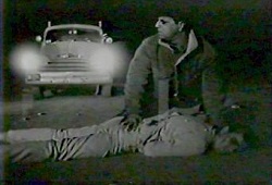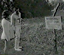Sexy collegiate majorette Margie DeMar and her not-a-day-over-30 classmate and beau Howie Ellison run into car trouble on a rural road, and opt to take a shortcut across farmland, despite a clearly marked “Warning! Keep Out” sign. Naturally, hardened criminals of this ilk fully deserve to be shot on sight for their nihilistic law-breaking, and sho’ nuff, they do indeed find themselves dodging rifle fire.