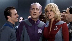 The movie starts at such a convention, for the long-cancelled sci-fi show Galaxy Quest. The fans are there in their costumes, the vendors are there selling all manner of Quest-related tat, and backstage, the cast are waiting to appear on stage. But you can tell straight away that they are tired of it all. Not the success of the show, or the fans themselves, but of Jason Nesmith (Tim Allen), the very Kirk-like Captain Peter Taggart. Nesmith loves all this stuff, and never seems to notice, or give credit to, his co-stars. So Sir Alexander Dane (the alien Dr Lazarus), Gwen DeMarco (the lovely Tawny Madison), Fred Kwan (Chief Engineer, Deck Sergeant Chen) and Tommy Webber (former child actor and helmsman, Laredo) are very sceptical indeed when Nesmith turns up very late to an appearance and tells them a tale. He has just returned from the other side of the galaxy, where he helped the Thermians, an alien race who contacted him at the convention, in their fight against the evil General Sarris. Actually, up until they sent him home, Nesmith himself thought it was an appearance for fans of the show in a studio somewhere…