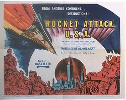 Are you aware of what would happen if militaristic types ran the Russian government? Did you know that the Sputnik satellite was gathering weather info to help aim Soviet missiles at American targets? If you answered "No" to either of these questions, it is your duty to drop everything (unless you're a dishwasher), race to your local bijou and order the manager to run Rocket Attack U.S.A. "for national security reasons." In the unlikely event he should refuse to obey a direct command from a member of the movie-going public, he is probably a card-carrying Communist; so, it's okay to toss him over the balcony.