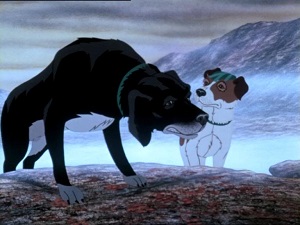 The message of animal rights was clear, particularly when the secret base is revealed as conducting research into germ warfare and therefore it is true to say the animals were unnecessarily mistreated for the sake of mankind's harshness and callous attitude to the planet, if you wanted to take the themes to their ultimate reading. But in the main this was an adventure tale with a tragic tone, so as with Watership Down there was blood, some of it human (Snitter sets off a rifle in one man's face by mistake, killing him), and some of it sheep's as guided by a fox with the voice of James Bolam, the two canine heroes worry, then savage the farmers' flocks in their hunger. There was no sentimentalising here, unless you counted the automatic emotion brought out by pets in peril and hand drawn at that, but you would be forgiven for feeling upset by what The Plague Dogs depicted, if not disquieted by its implications as well as its stark visuals.