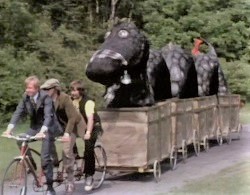 Last in this run was The Race, which began with them on their trandem, cycling through France only to be caught up in the excitement of the Tour de France - to the extent of winning the event. This inspires them to spend their holiday finding another competition to enter, and they settle on Le Mans, not realising it is a 24-hour car race, not a bike one, and none of them can drive. A "crash" course for Tim and Graeme's ingenuity with making a vehicle looks set for success, but there is a Dick Dastardly-style villain who sabotages every participant, this episode either inspired by cartoon Wacky Races, or its inspiration, hit sixties comedy The Great Race, but curiously reminiscent of Death Race 2000, then a couple of years in the future. Their solution was very Goodies.