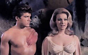 For the first twenty minutes, you will be wondering if you have the right film, as the setting was seventeenth century Scotland and the subject was witchcraft where the locals are putting various women to death by burning them at the stake. When a returning couple find themselves in danger of suffering the same fate, things look bleak until a man wearing just his pants (in the Scottish climate?!) rides up out of nowhere and determines to put an end to this practice. He was Maciste, played by Kirk Morris (an actual Italian muscleman, not an import), and he did so by descending into the Roman Hades to track down a witch who had already been executed. In its setting of a cave network popular with tourists, we see writhing bodies, a fearsome (i.e. drugged/stuffed) lion, a cyclops, flashback footage to other Maciste films, and a general air of skewed decadence.
