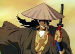 After seeing so many sci-fi anime flicks lately, an anime period adventure seems a little odd. But I guess Ninja Scroll the series would seem a little odd anyway. As soon as the show begins, we see a group of freaks fighting in a field full of luminous magic mushrooms (and they are magic mushrooms – check your reference books, fungus fans!). These freaks really are freaks too. There’s a horrible chick whose special weapon is a legion of flesh-eating caterpillars crawling beneath her skin. There’s this other, giggling fuck-up who fights with a king-sized umbrella – at the drop of a hat it turns into some sort of flying unicycle. Jubei, the mercenary ninja, jumps in with all swords blazing, reducing these monstrosities to well-minced mincemeat. The victim of these creatures, Rouga, asks Jubei to be his bodyguard. Jubei declines, self-righteously stating that he can’t trust a man who wears a mask.