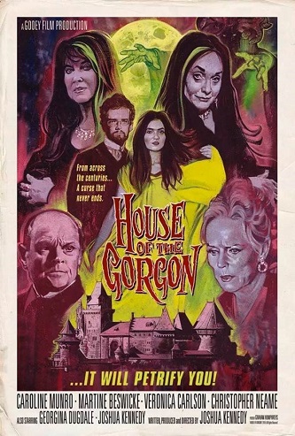 Filmed in the style of the classic horror films of yesteryear, HOUSE OF THE GORGON brings together four original Hammer film stars for the first time in a feature film! The story follows the young Isobel Banning (Georgina Dugdale - Caroline Munro's real-life daughter) as she travels with her mother (Veronica Carlson, Dracula Has Risen From the Grave, Frankenstein Must Be Destroyed) to marry her university sweetheart Dr. Julian Pritchard (Joshua Kennedy). Along their journey they meet the mysterious Father Llewellyn (Christopher Neame, Dracula A.D. 1972, License to Kill), the local priest, who refuses to divulge the terrible fact that two ancient gorgon sisters (Caroline Munro and Martine Beswicke) have taken up residence in the nearby manor house.