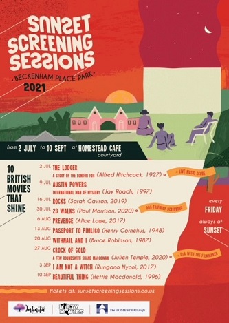 British cinema will shine like never before in South East London this summer, and you too can catch the sun rays! Sunset Screening Sessions will present 10 glistening British films every Friday night after sunset at Beckenham Place Park, from July 2nd to September 10th. Britain is colourful and diverse: our programme includes comedy, horror, thriller, drama Black, LGBT movies and more, spanning from present-day all the way back to the beginning of the 20th century. You will get dazzled by the light!